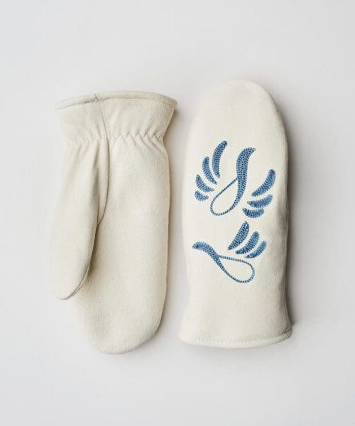 Genuine Deersuede polyester/acrylic pile lined mitt. Inseam sewn with elastic shirred wrist. With blue embroidered Snowbird pattern on back of mitt. Colour: Black or White