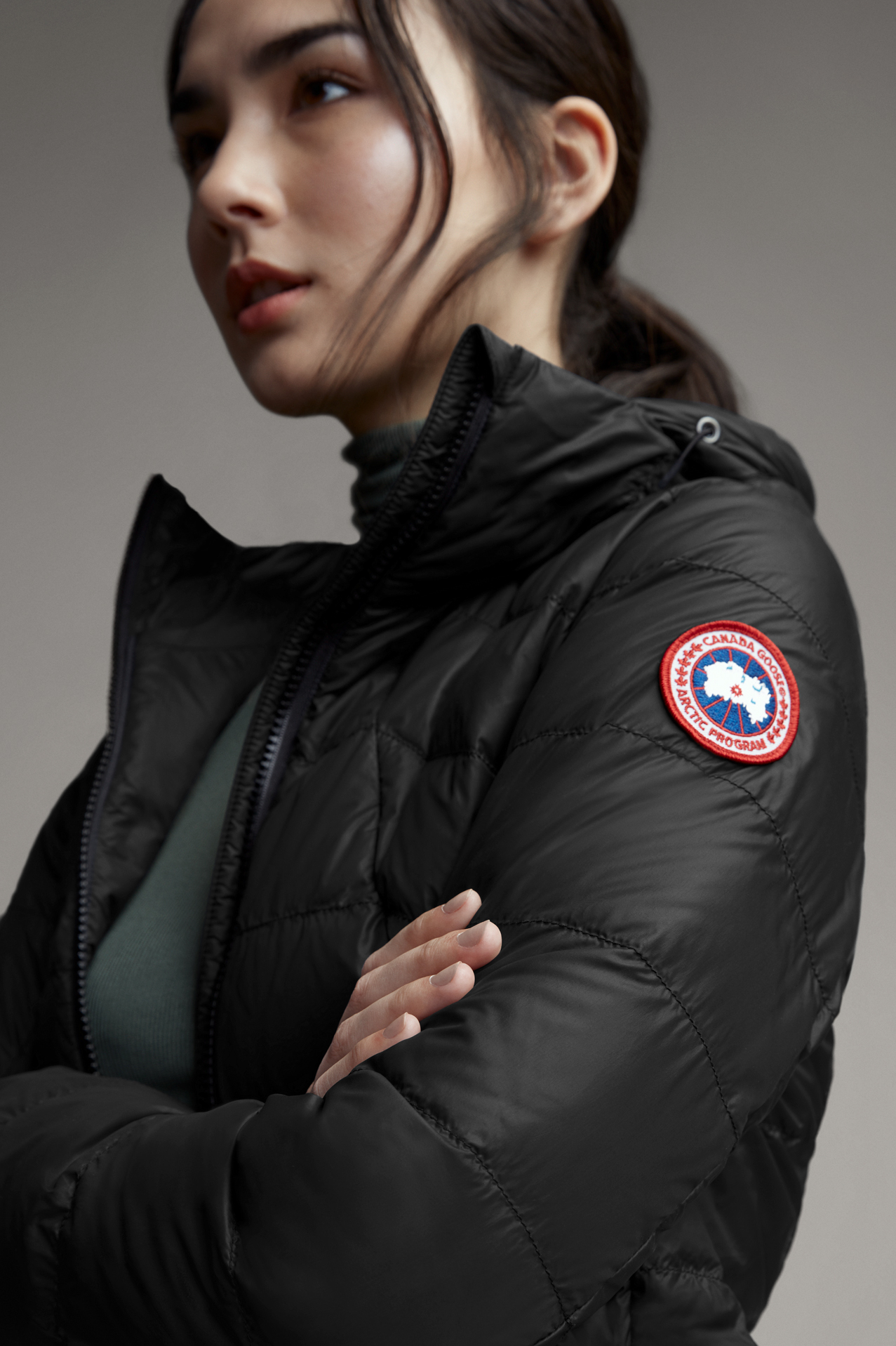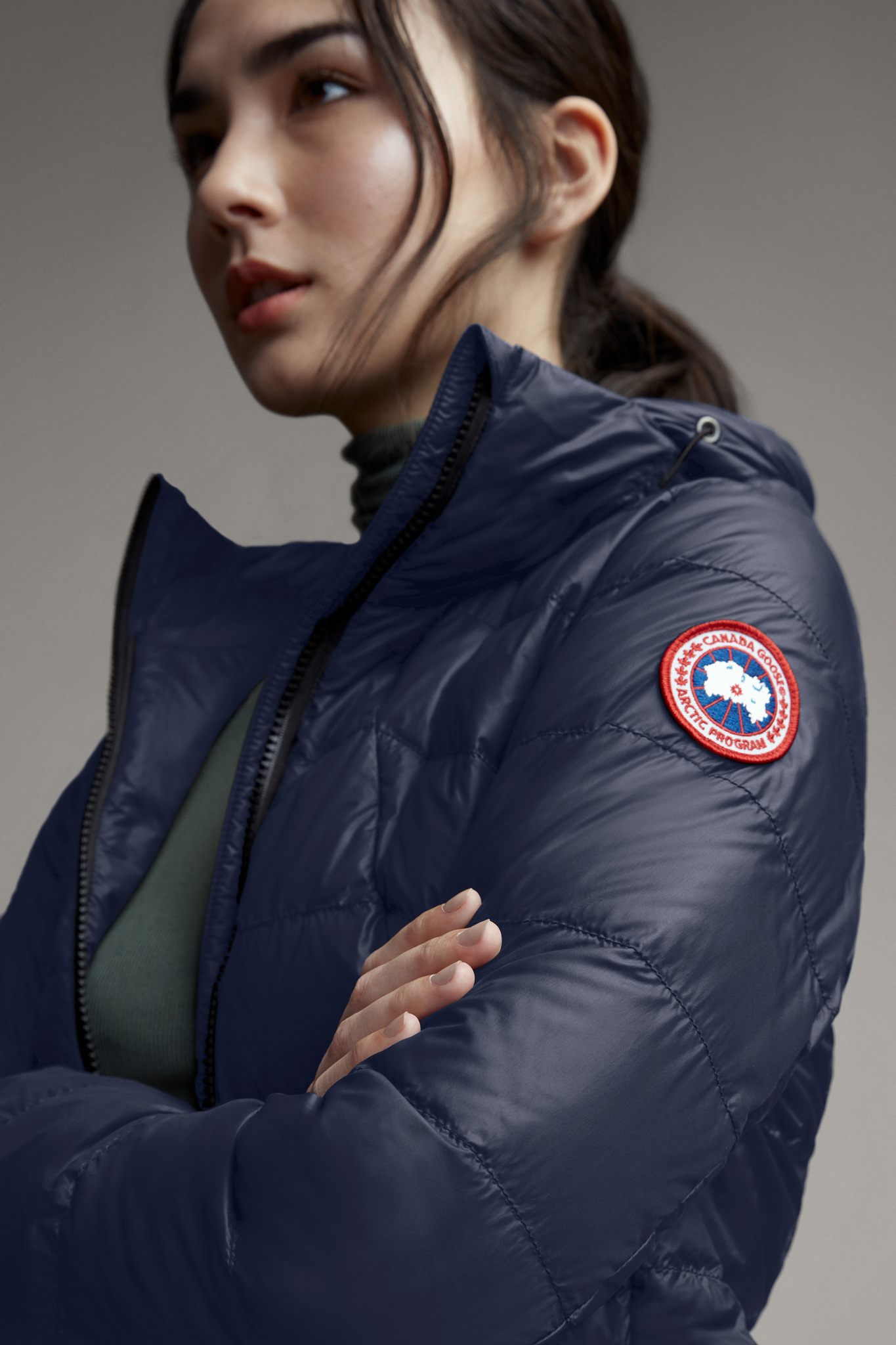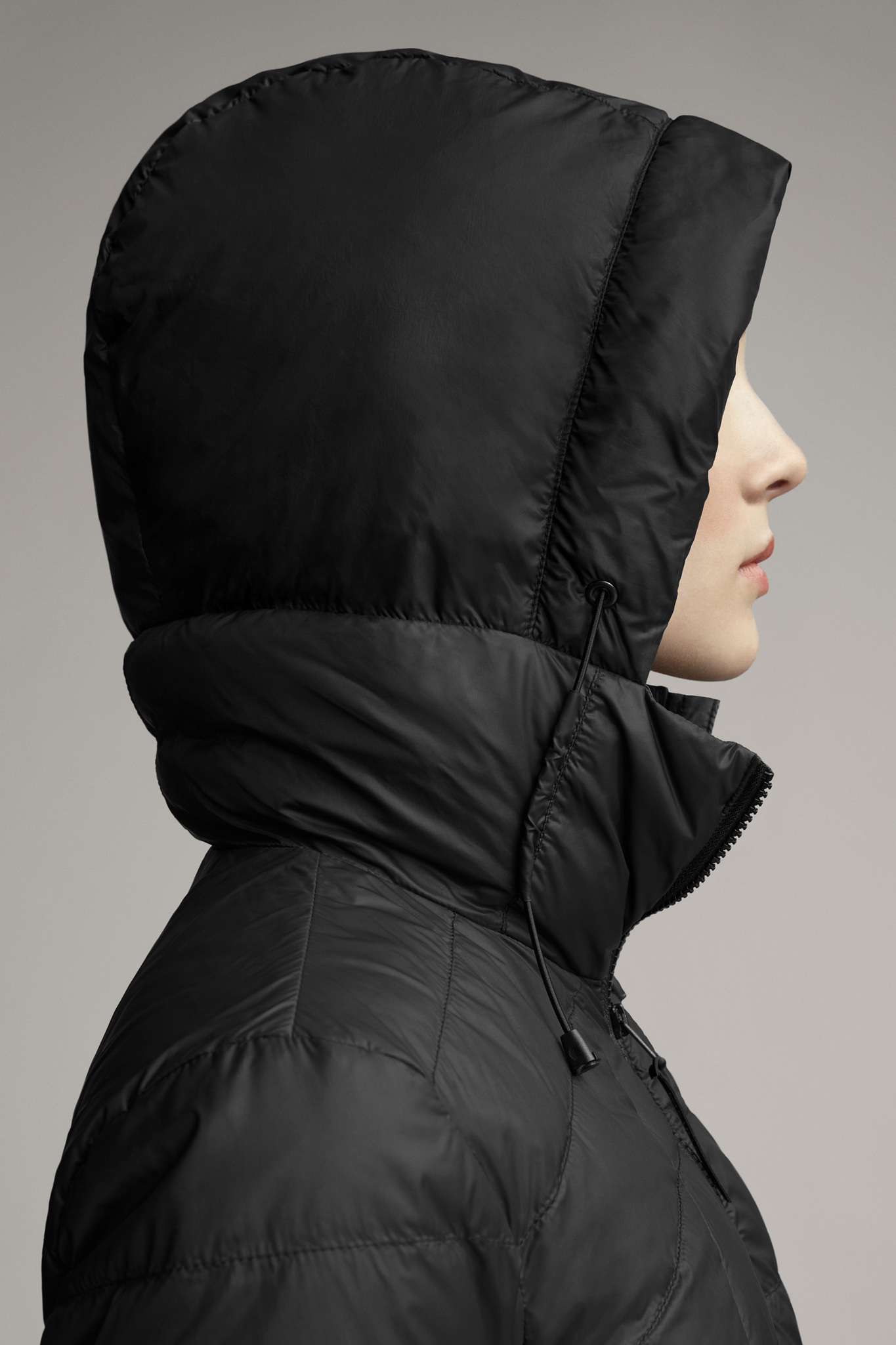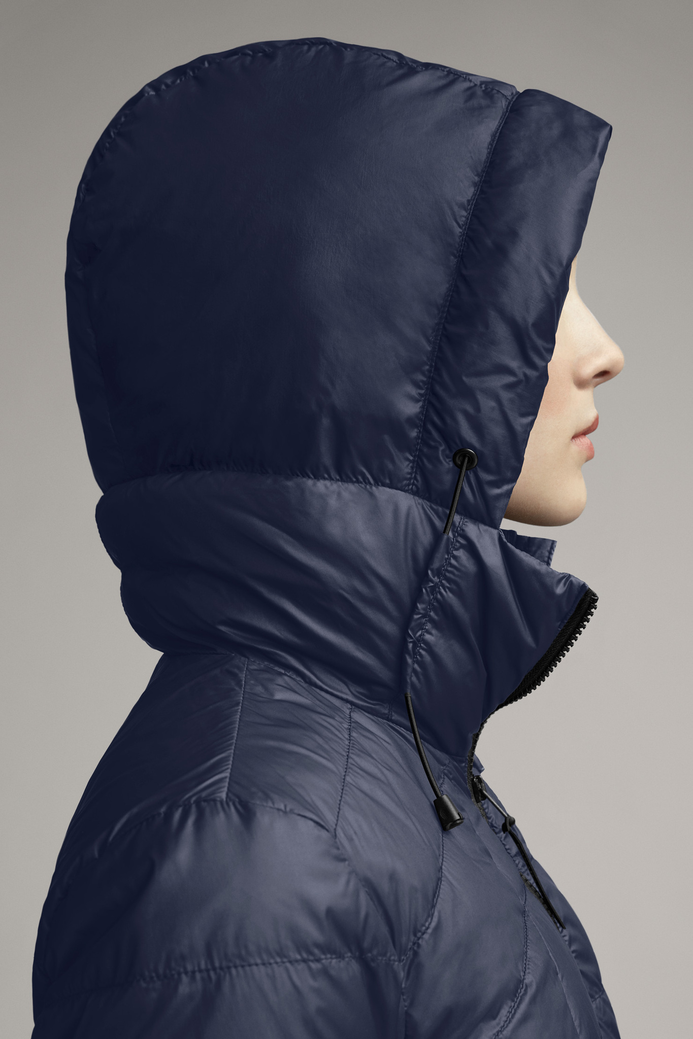 - Adjustable down-filled hood adds warmth and element protection. Signature double-stripe reflective details at back of hood for added visibility in low light