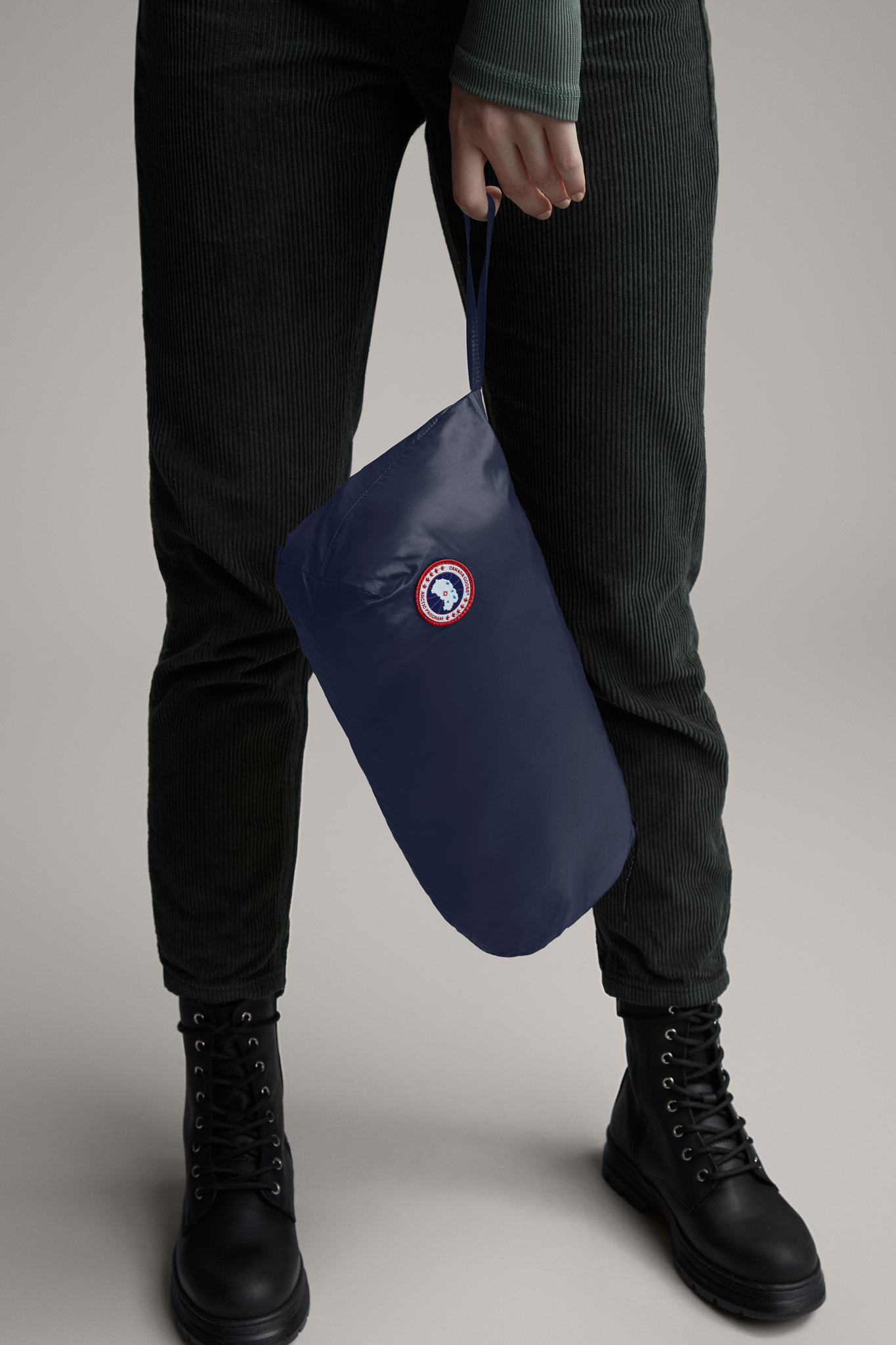 - Packable into wearer’s interior left pocket. When packed, it has a carrying loop that can be used with a carabiner to clip onto a bag or waistband for easy travel