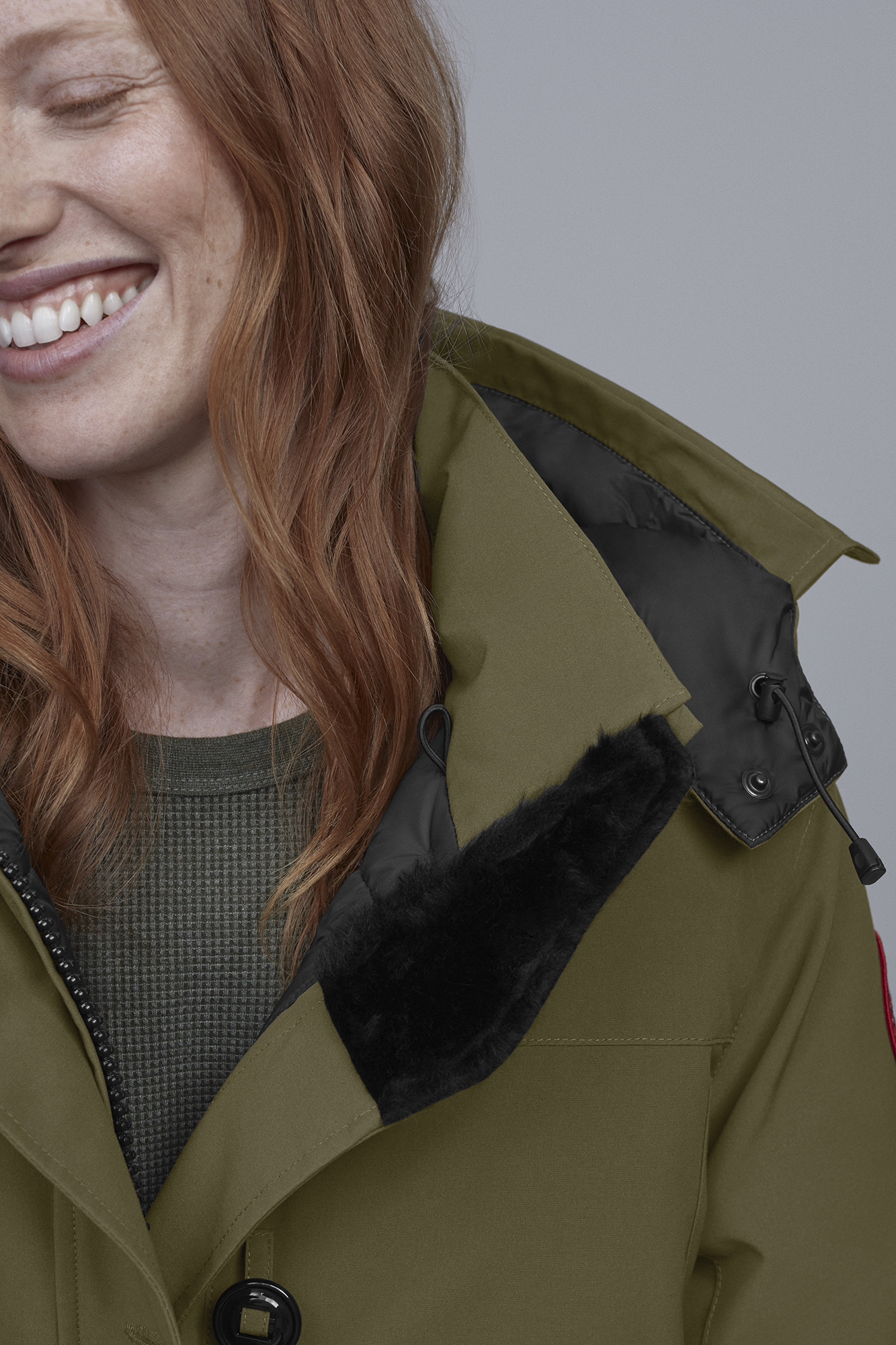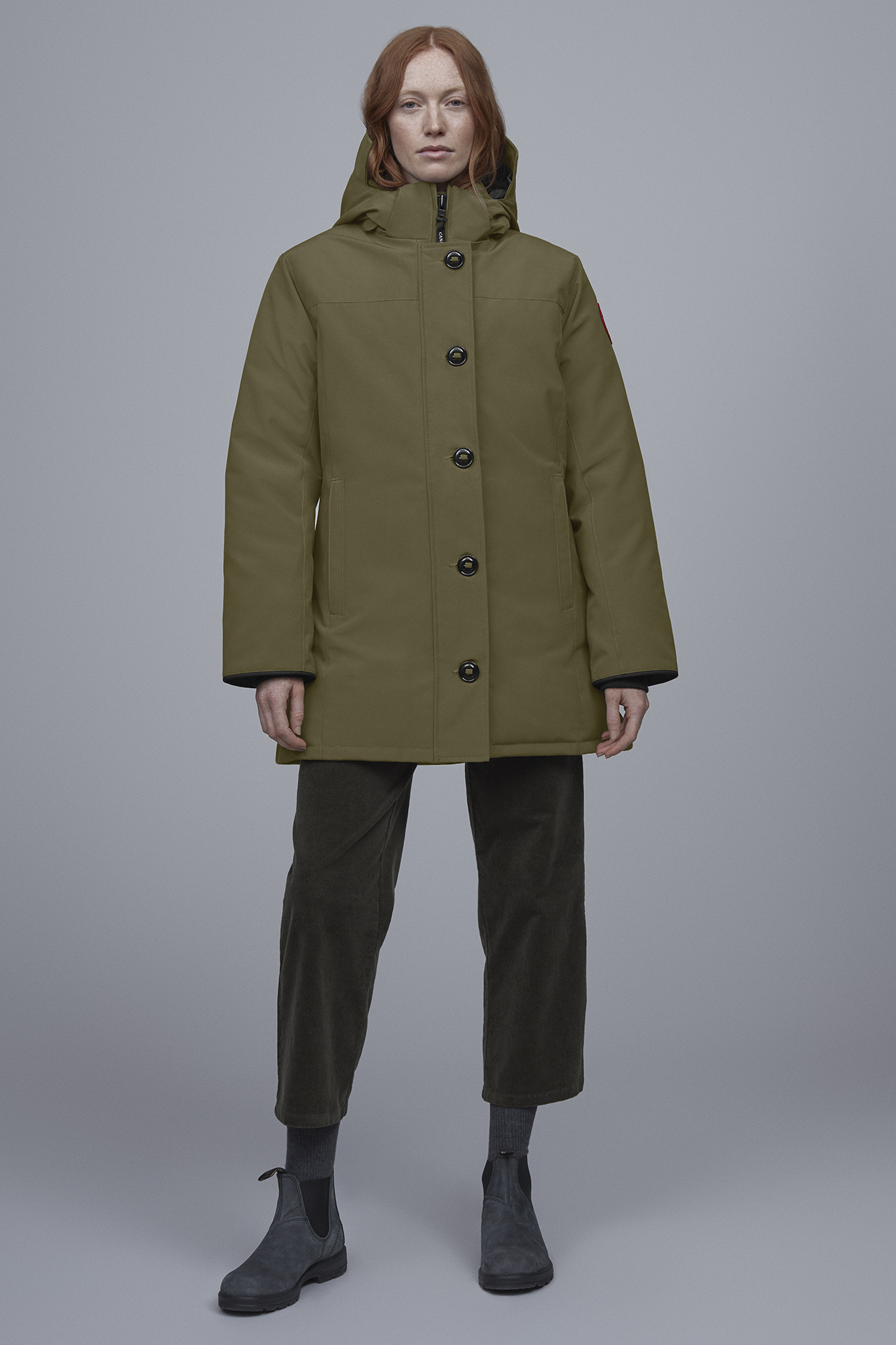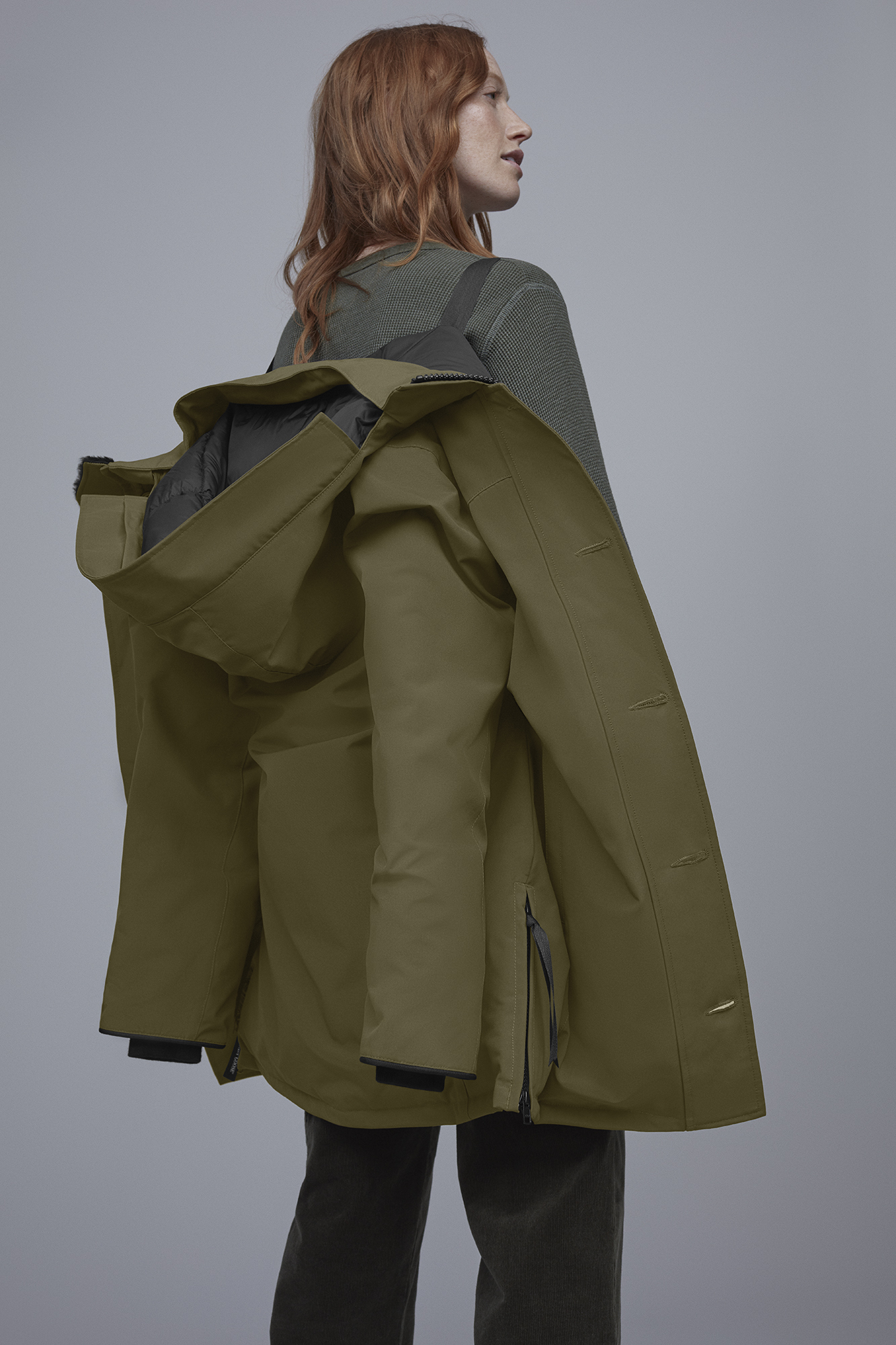 - Storm flap over centre front zipper secured with military button closure