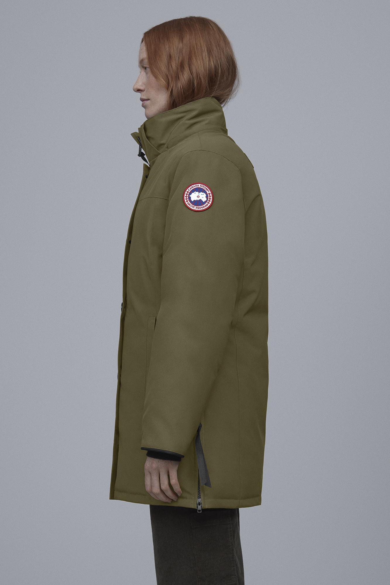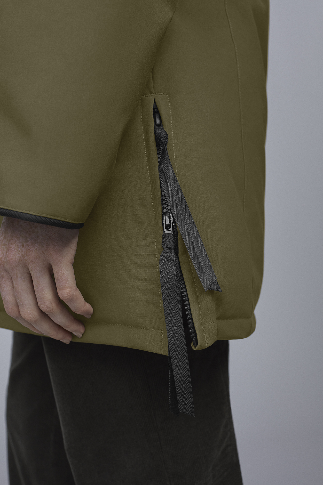 - Lower front hand warmer pockets secured with zipper closure