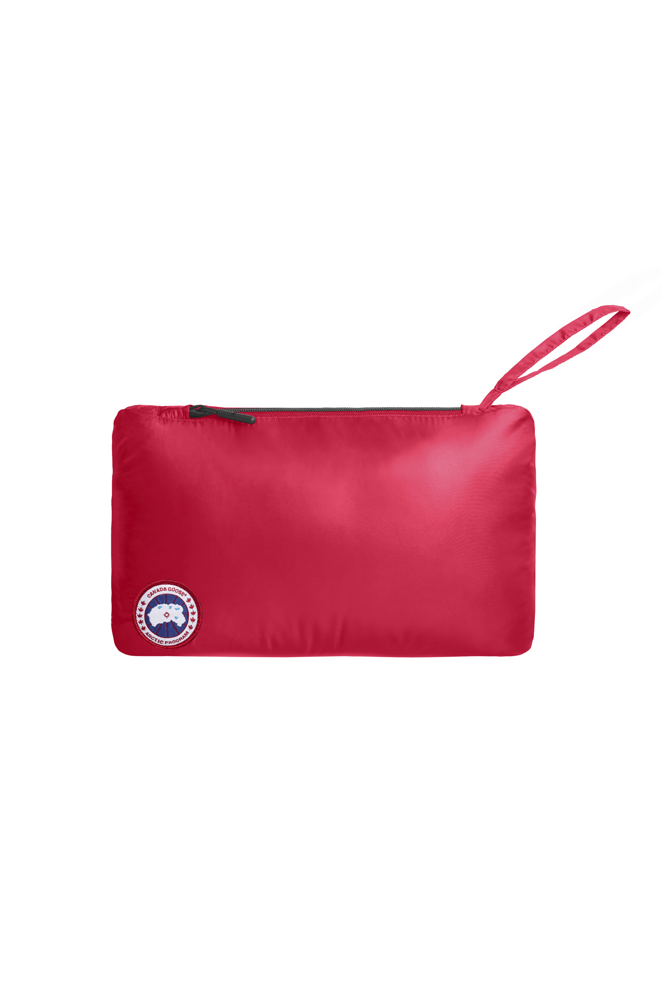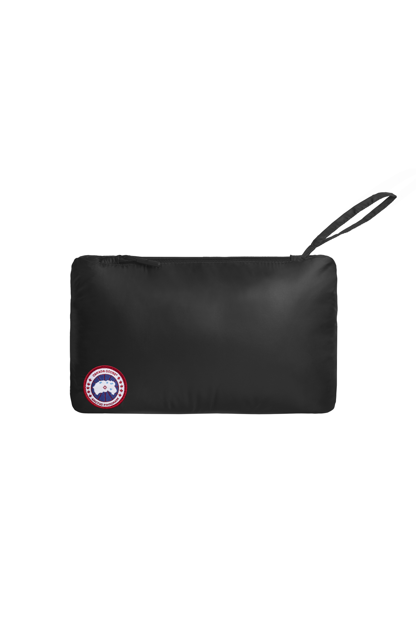 - Packable into wearer’s exterior right pocket. When packed, it has a large hoop for hand-held carrying, and a smaller loop for a carabiner to clip onto a bag or waistband