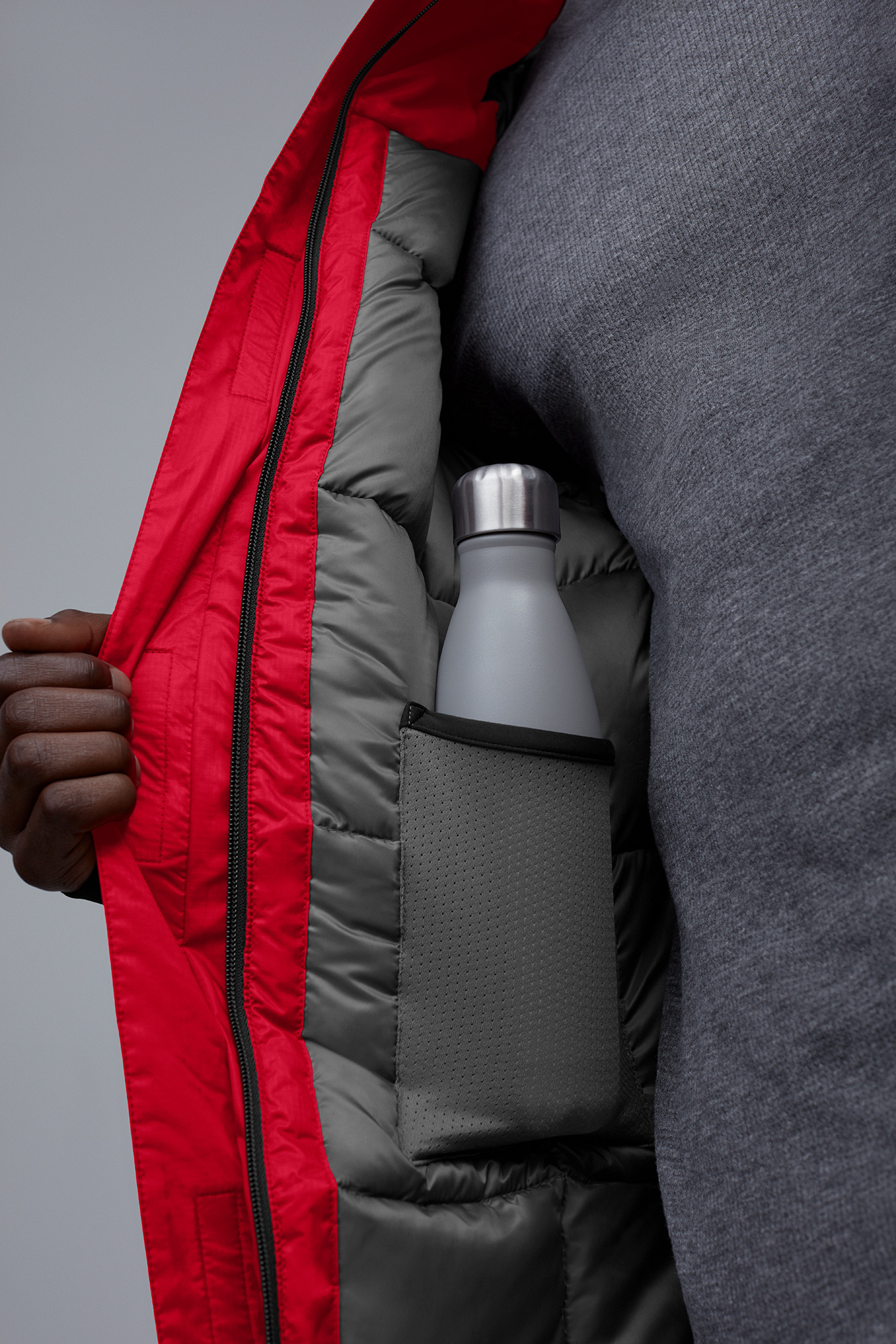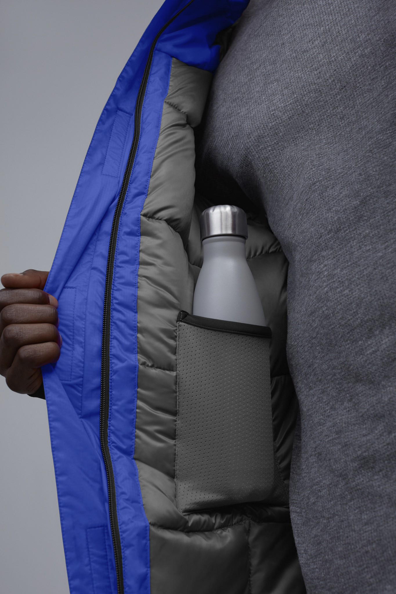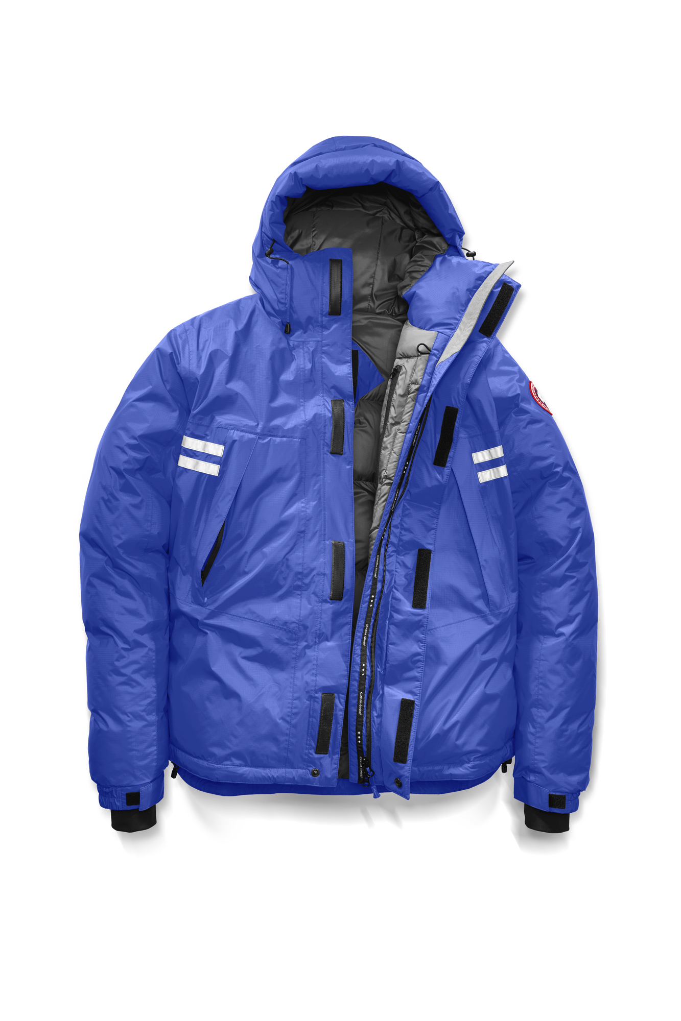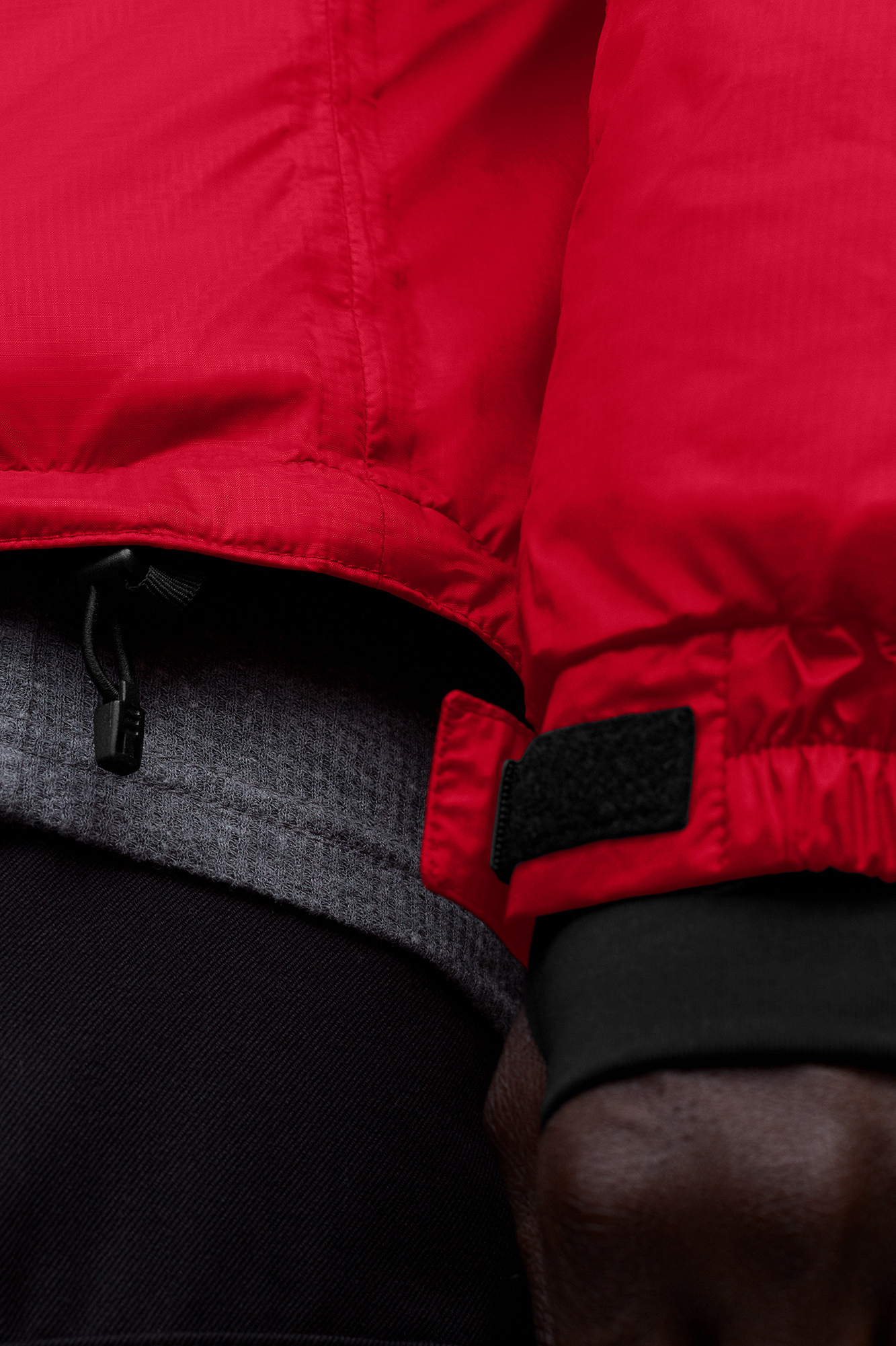 - Double placket with Velcro® closures over 2-way zipper keeps the elements out. Unzip from the bottom for added range of motion or venting