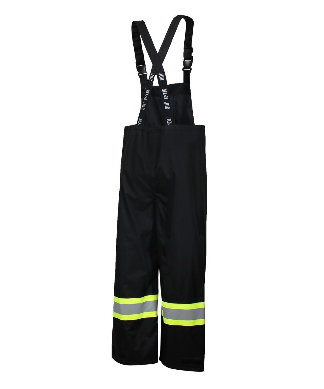 High visibility waterproof overalls made of Endura nylon 600 Deniers, with nylon lining, sealed seams, reflective stripes, adjustable elastic suspenders and a zipper at the bottom of the leg.