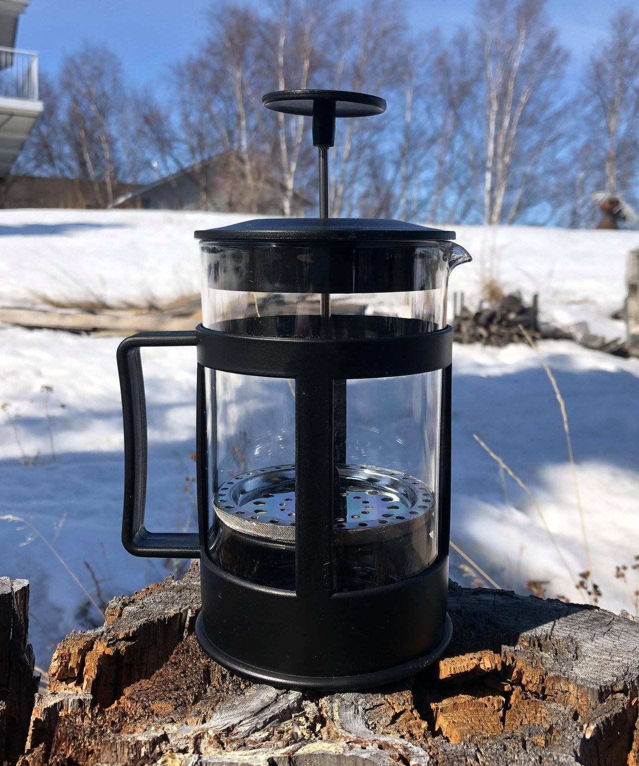 • French press style lid brews fresh coffee or tea at home, cottage, boat or campsite