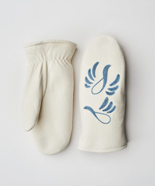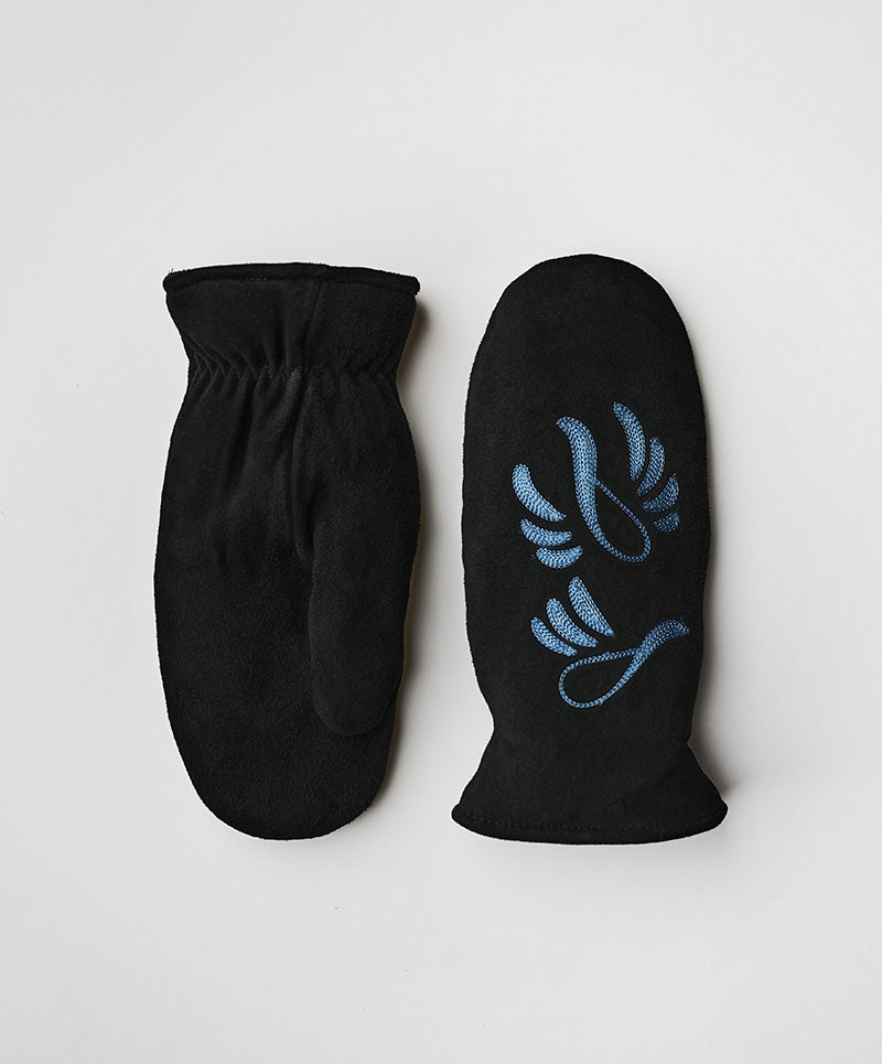 Genuine Deersuede polyester/acrylic pile lined mitt. Inseam sewn with elastic shirred wrist. With blue embroidered Snowbird pattern on back of mitt.