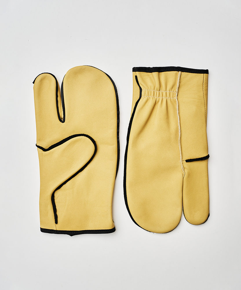 Genuine Cowhide unlined One Finger Mitt. With chopper thumb, fully welted seams, bound top and elastic shirred wrist.
