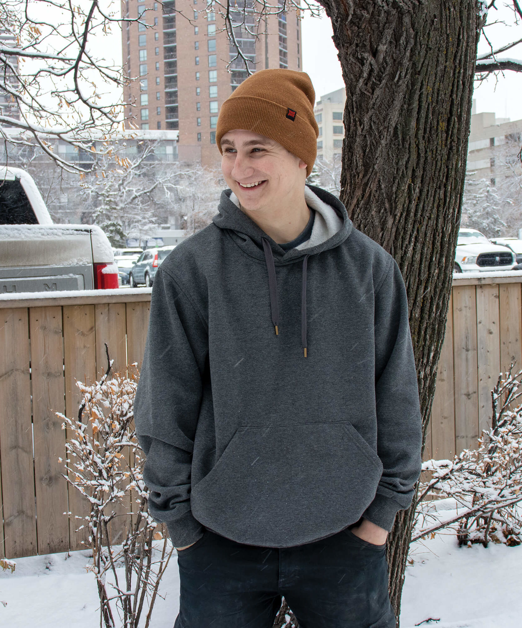 You’ll cut a traditional silhouette through the crisp morning in this classic pullover hoodie. It features a generous kangaroo pocket to stow your hands with a zippered media pocket inside. No lost or damaged phones here.
