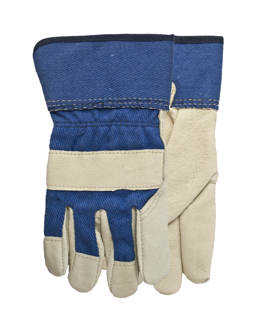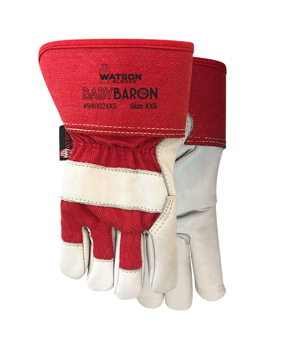 Durable full-grain cowhide leather Cotton drill back Protective hooded fingertips and reinforced knuckle bar Snug-fitting shirred elastic wrist Slip-on safety cuff Made for a kid’s hands