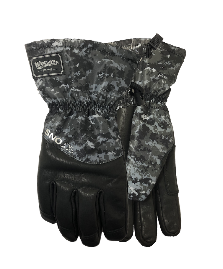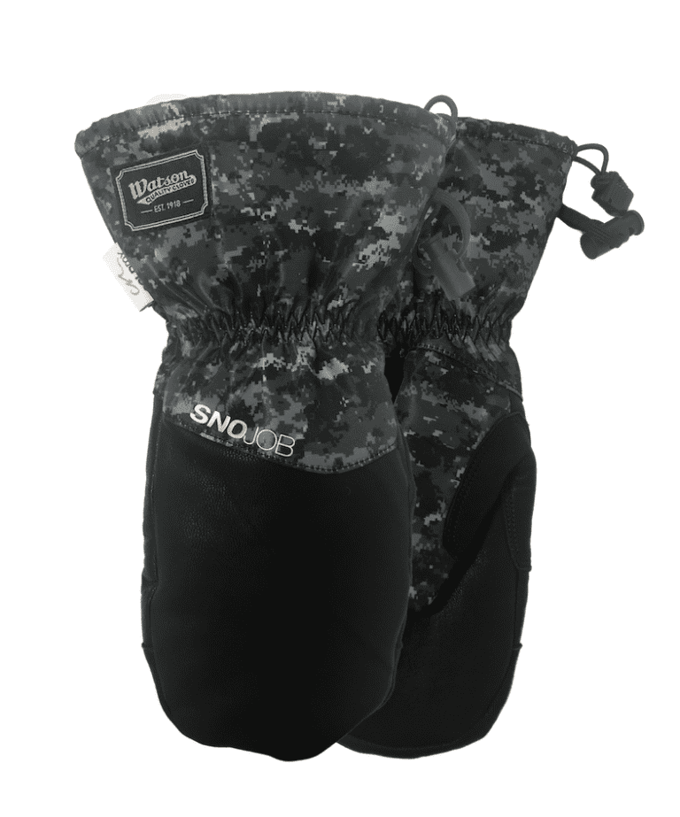 Polariz™ microfleece lining 3M Thinsulate™ C200 lining Hy+Dry® barrier Dryhide™ water resistant full-grain goatskin leather palm, thumb saddle and mitt cap Water resistant taslon with digital camo print Snug-fitting shirred elastic wrist Extended slip-on style gauntlet cuff