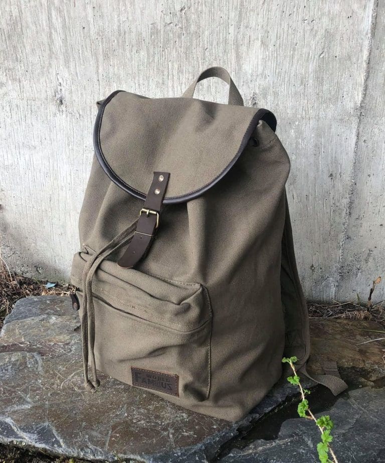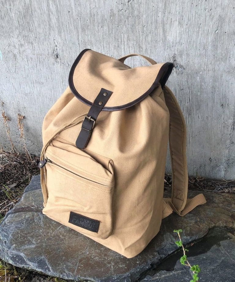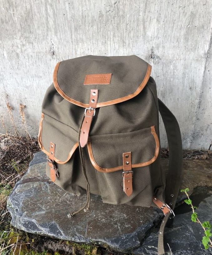 Heavy cotton canvas and leather pocket closures 1 main compartment with 2 outside pockets 17″ x 19″